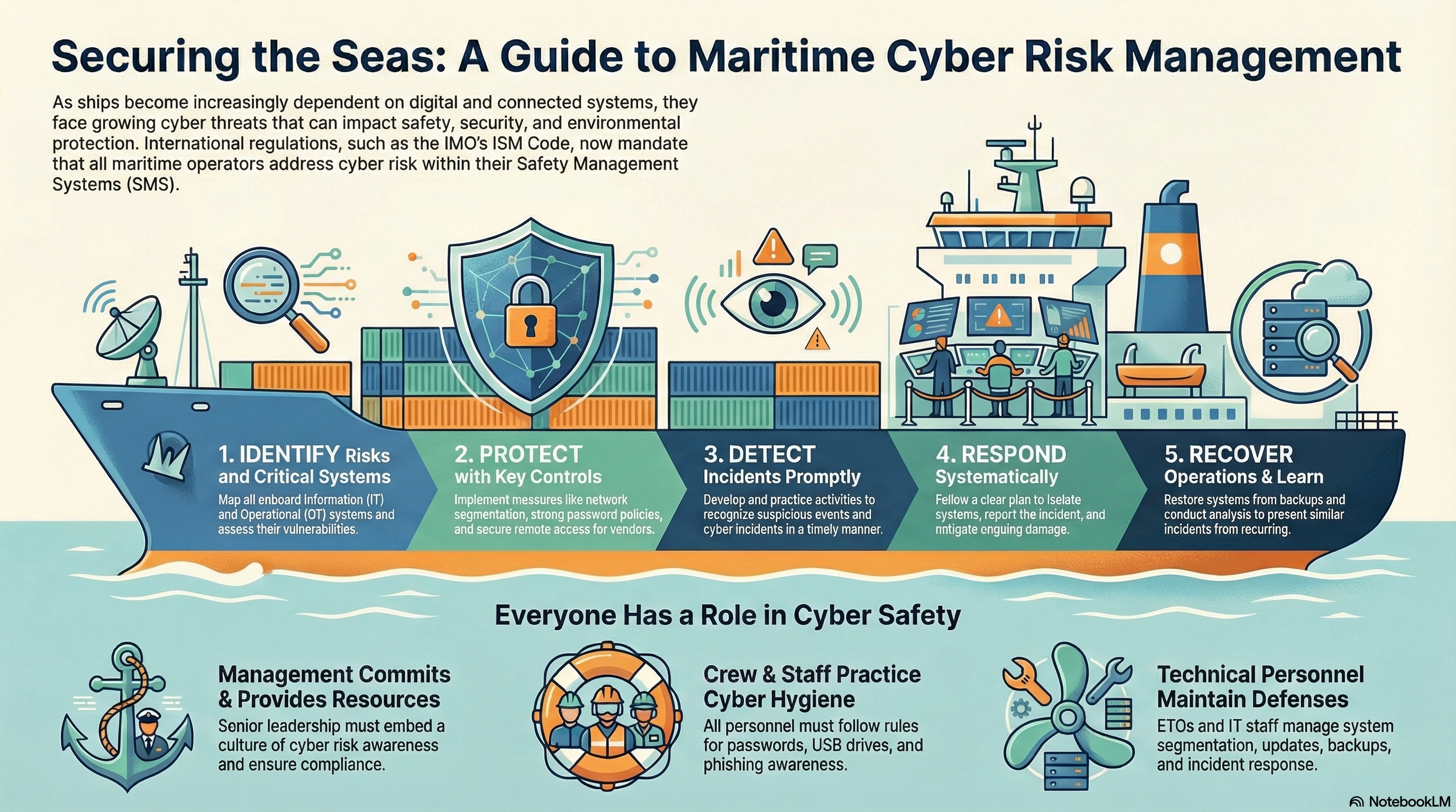 The course explains the difference between IT (office/guest networks and data) and OT (navigation, propulsion and control systems), highlights common real-world threats (phishing, unsafe USB use, uncontrolled vendor access), and provides practical crew actions for prevention and the first response to incidents, aligned with the ISM Code (SMS) principles and company procedures.